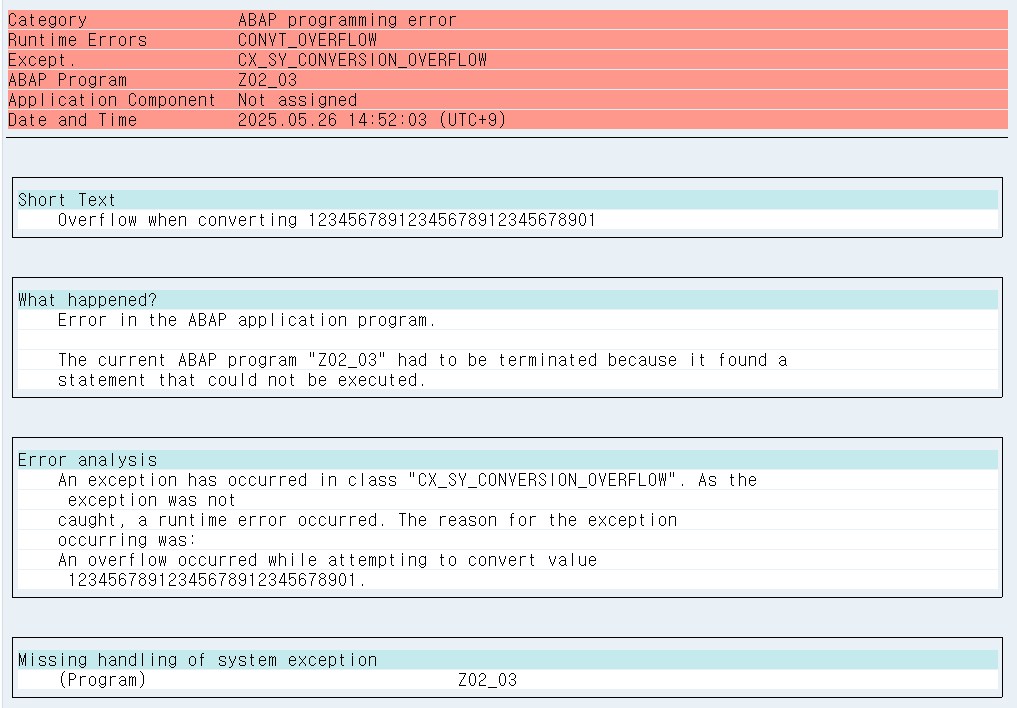ABAP CX_SY_CONVERSION_OVERFLOW - Packed Type(P) 변수 오버플로우 에러 해결 (2) | 2025.05.26 |
